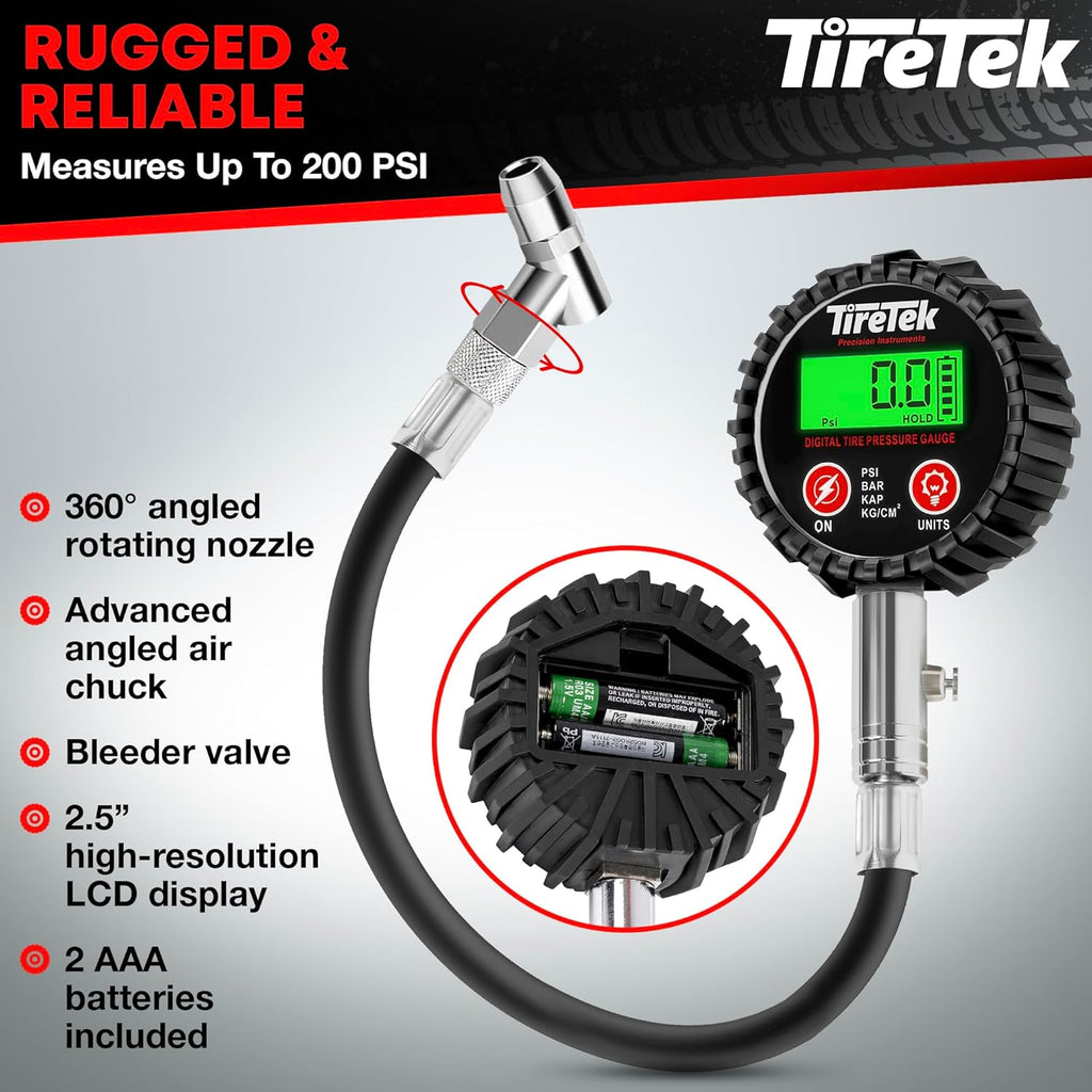 - DIGITAL TIRE PRESSURE GAUGE - Special design with a long, flexible rubber hose and a 360 degree angled rotating nozzle, enabling you to take a reading from a tire valve at any angle. This is a high-quality tire pressure