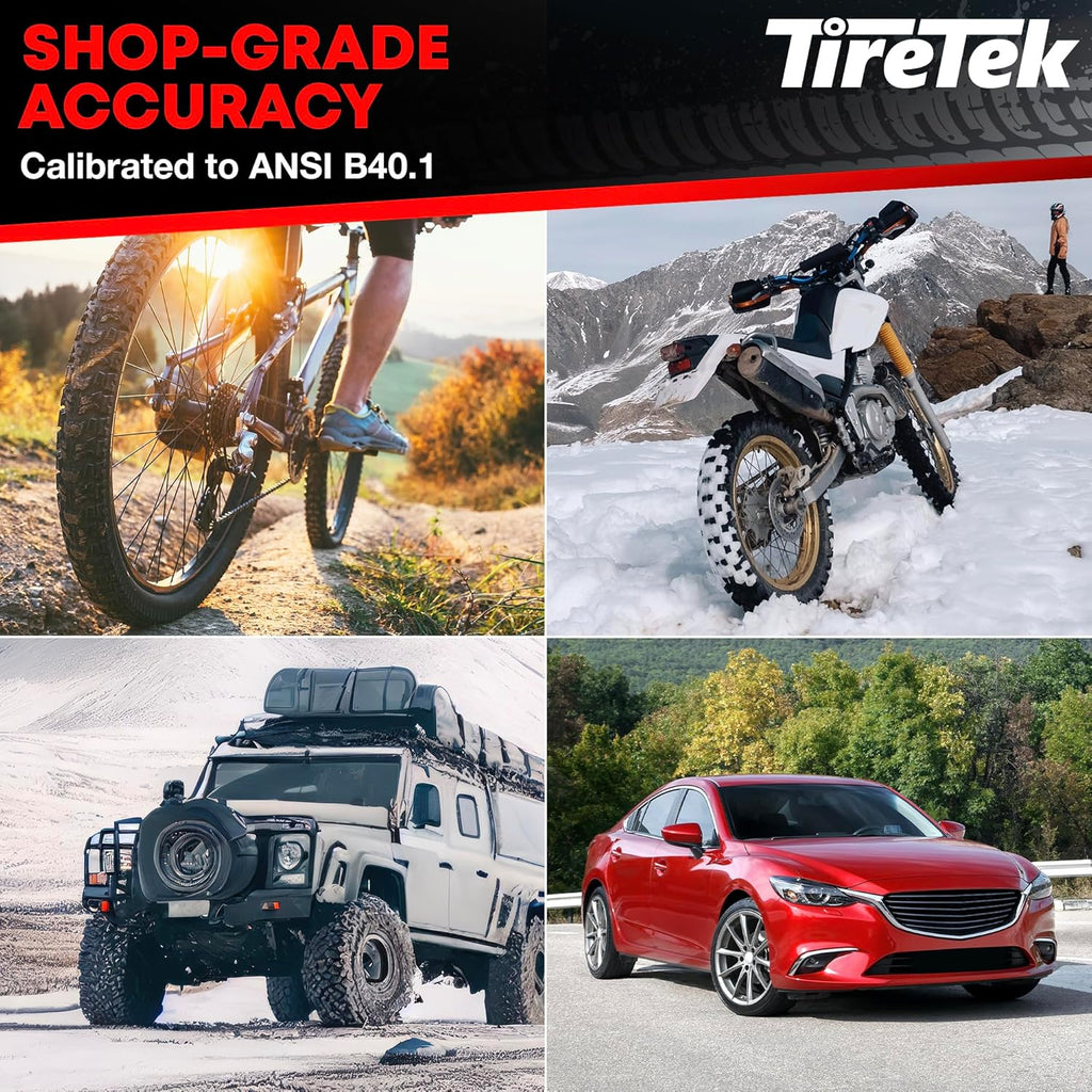 - ACCURATE - Air pressure tire gauge monitor calibrated to ANSI B40.1 Grade B (2%) international accuracy standard to ensure you get an exact reading. An integrated air release valve for precise pressure adjustment and a holding function so you can easily read your motorcycle tire pressure.